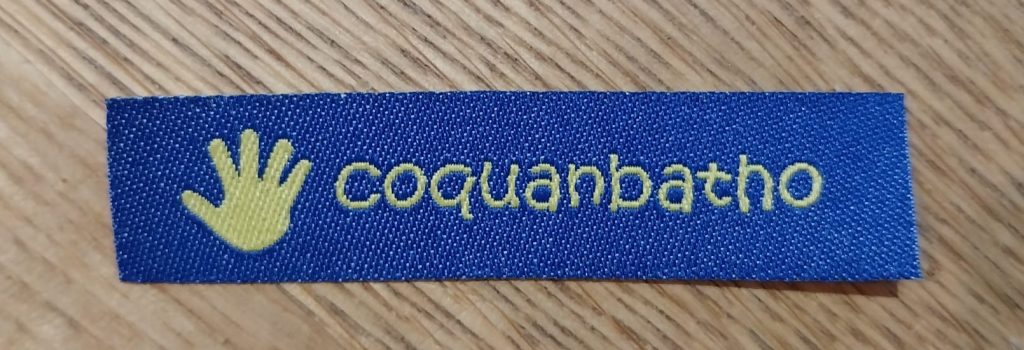 C’est mon « nom de fabrique » quand je crée quelque chose. Les étiquettes coquanbatho permettent d’identifier mes cousettes lorsque je les offre et ont un côté pratique pour déterminer le devant du dos sur les vêtements que je couds. Ce mot bizarre n’est pas en rapport avec la mer ou les bateaux comme on pourrait peut-être le penser. Il s’agit du début des prénoms de mes enfants, de mon conjoint et du mien, soit 5 prénoms. La main n’a pas été choisie par hasard non plus : elle représente évidemment le « fait main » mais aussi les 5 membres de notre famille.
